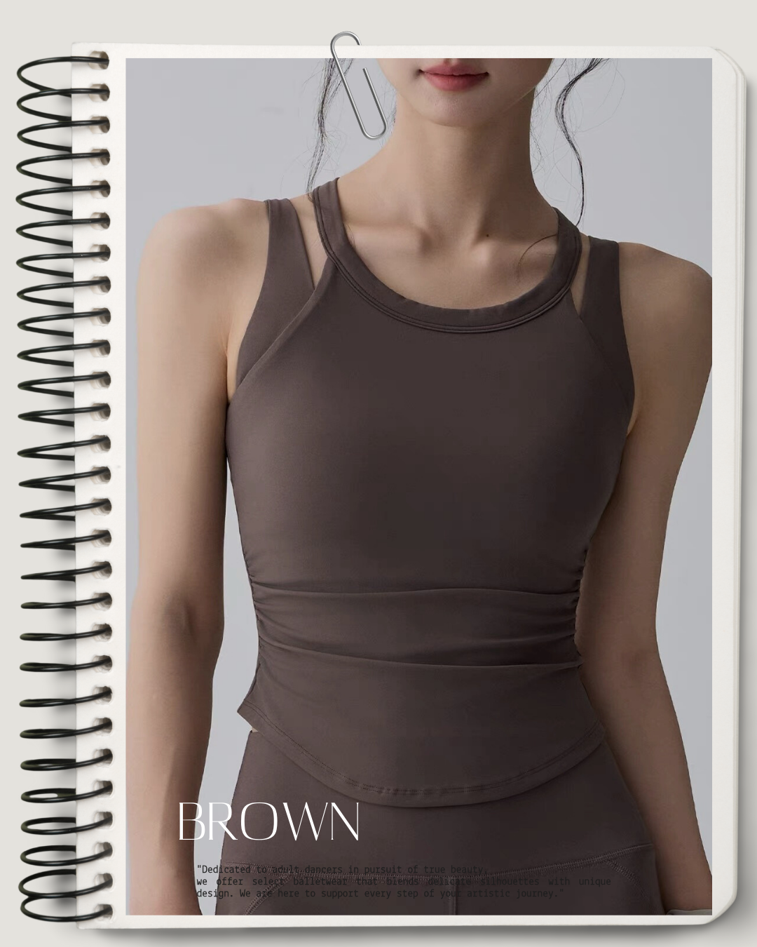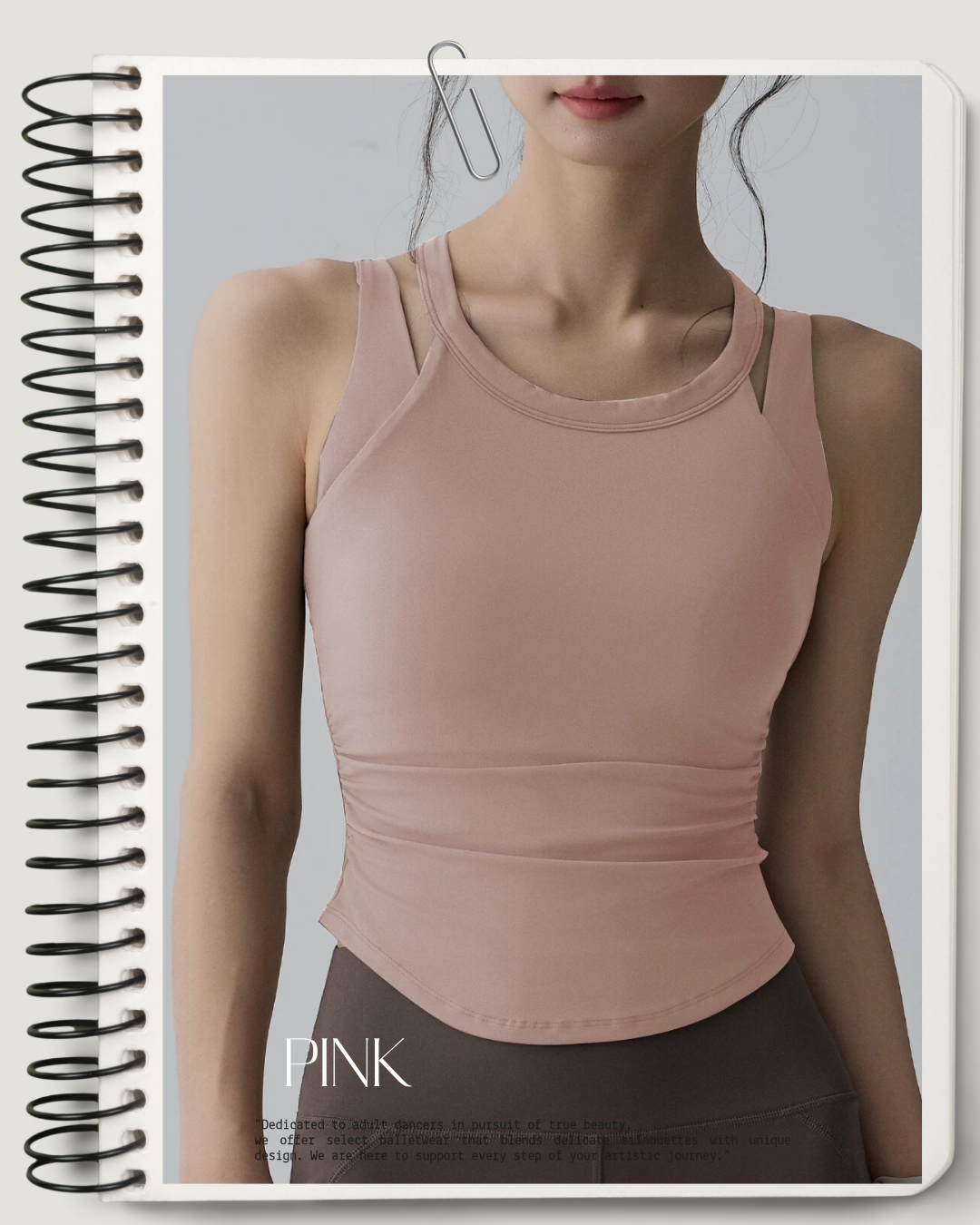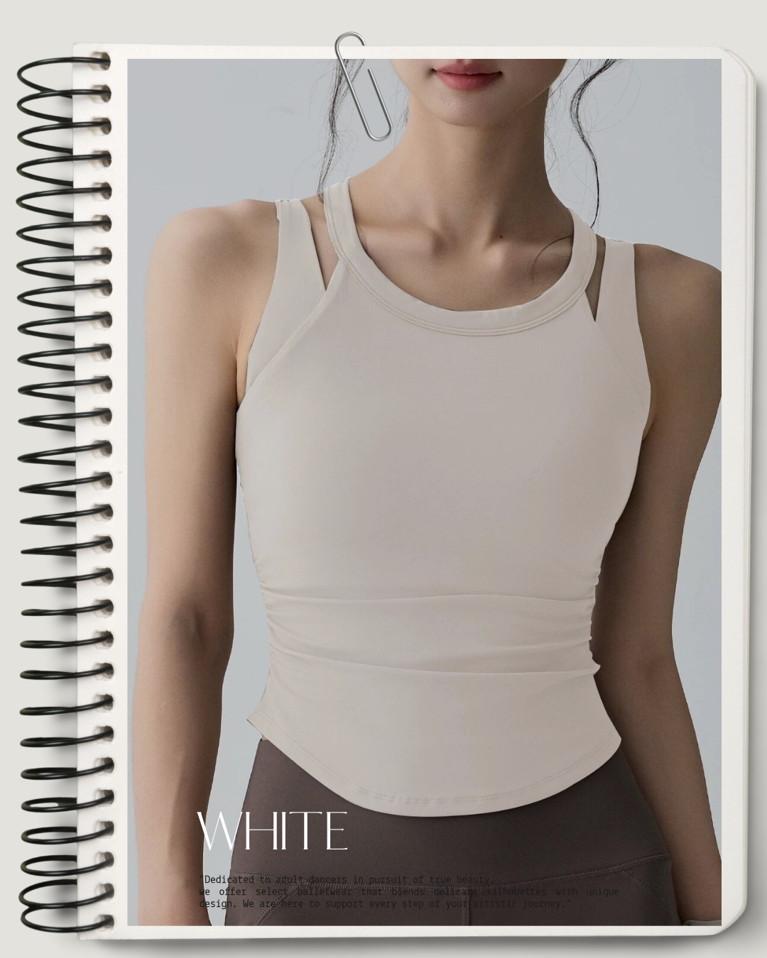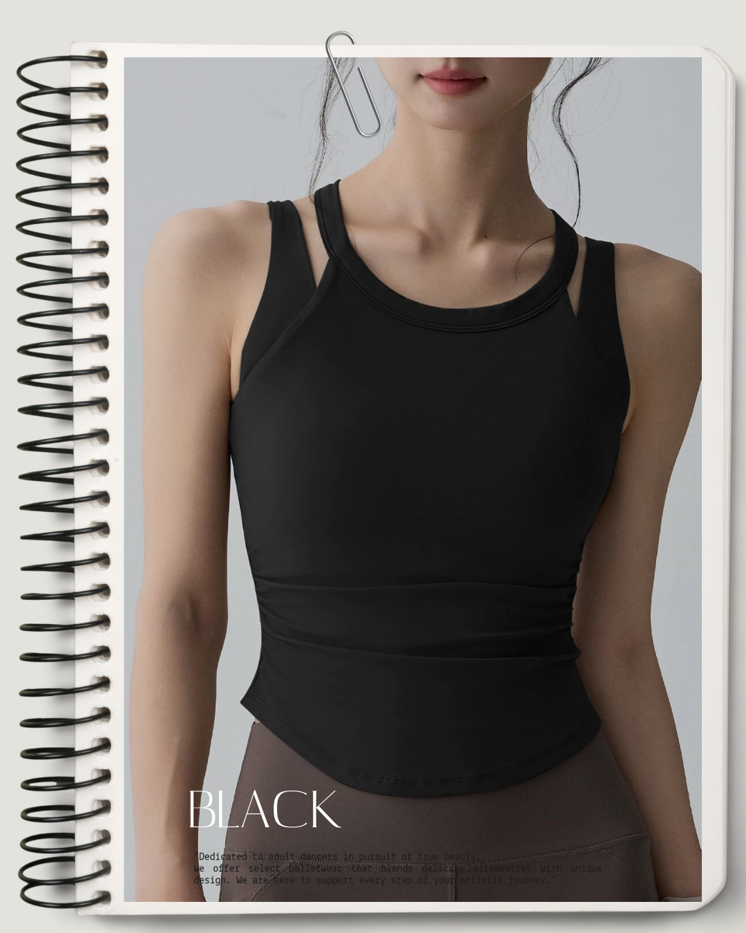 首元にレイヤードデザインを取り入れたスリーブレストップ。身体に沿うシルエットがラインをすっきりと見せ、レッスン時の動きにも自然になじみます。インナーとしても一枚でも使いやすい、バレエシーンに寄り添う一枚です。