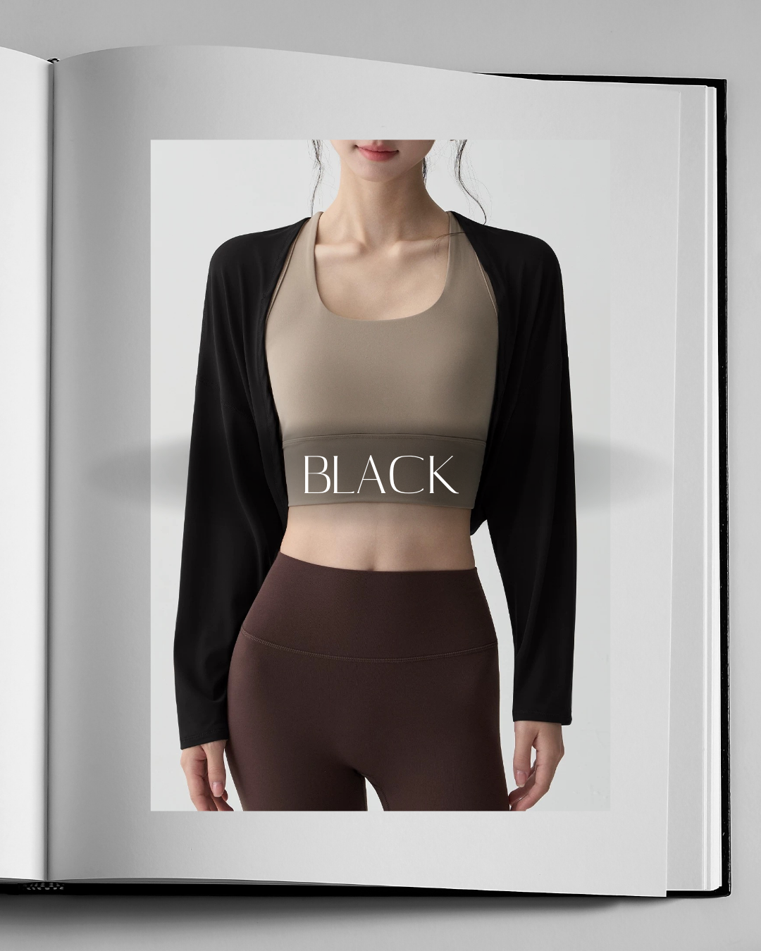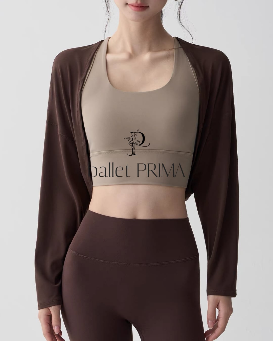 ラップデザインを取り入れたショート丈のボレロ。身体に沿うバランスで、腕まわりを自然に包み込みます。トップスとのレイヤードがすっきりまとまり、レッスン前後にも取り入れやすい一枚です。