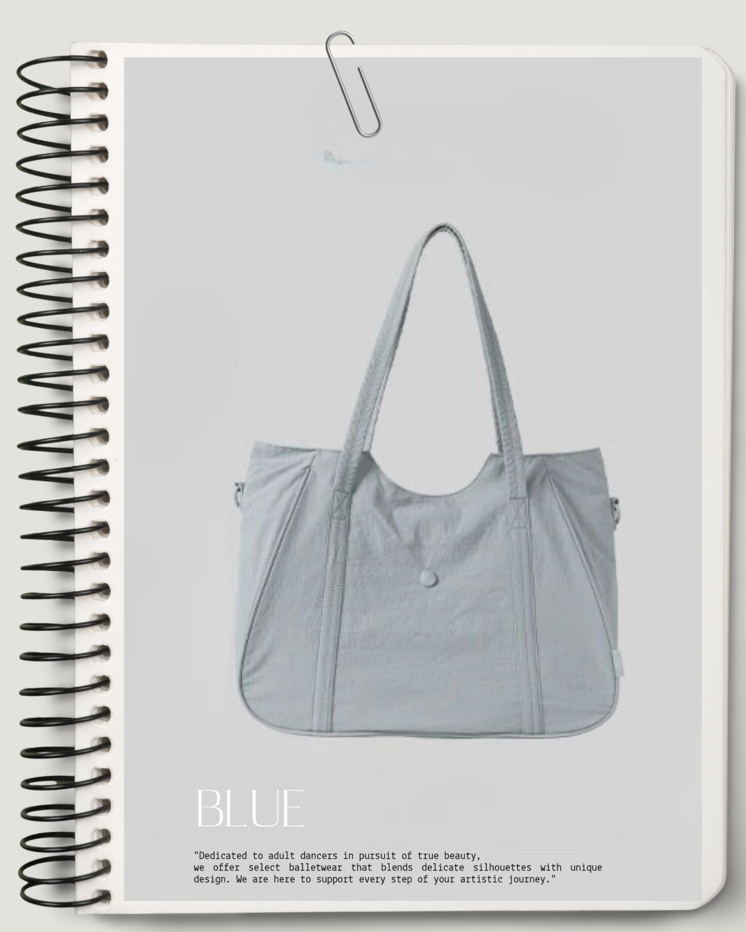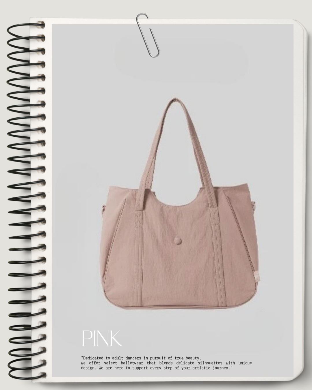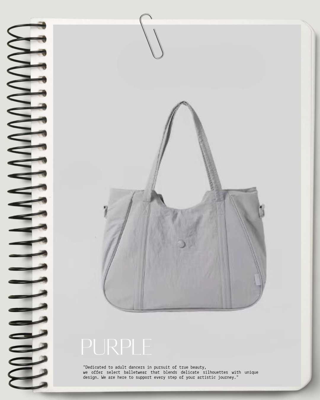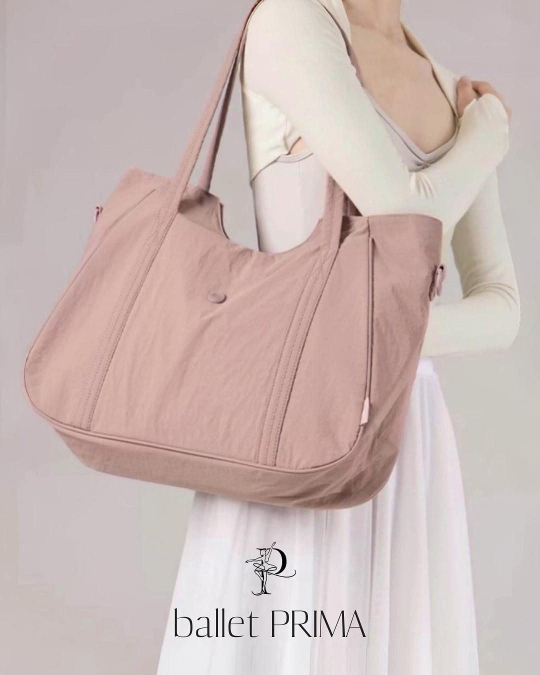 レッスンに必要なシューズやウェア、小物をまとめて収納できる大容量トートバッグ。軽やかな素材感で肩掛けしやすく、スタジオへの移動も快適にサポートします。シンプルで柔らかなフォルムがコーディネートに馴染み、毎日のレッスン用バッグとして取り入れやすいデザインです。