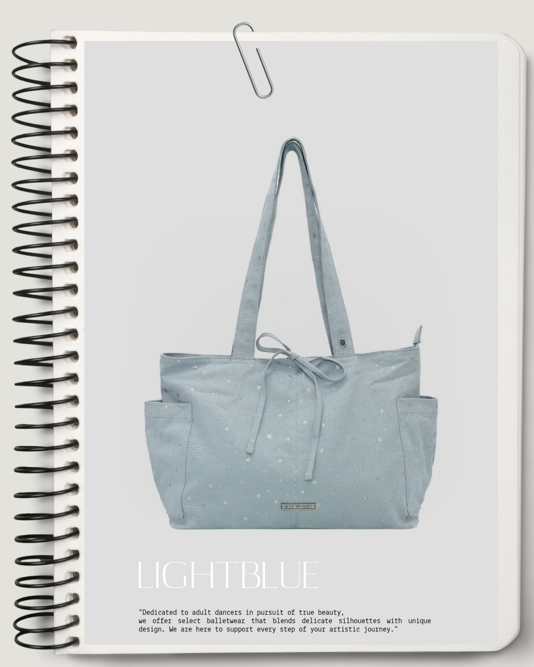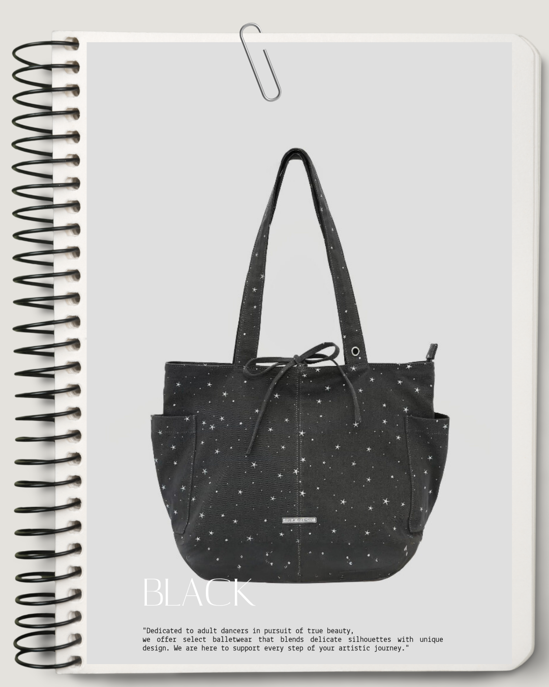 星モチーフの総柄デザインが目を引くバレエテイストのトートバッグ。フロントリボンと外ポケット付きで、デイリーからレッスンシーンまで使いやすいバランスに仕上げています。コーディネートにさりげなくアクセントを添えるバッグです。