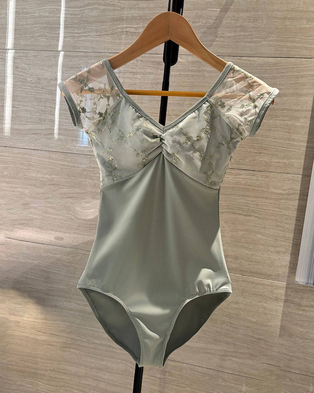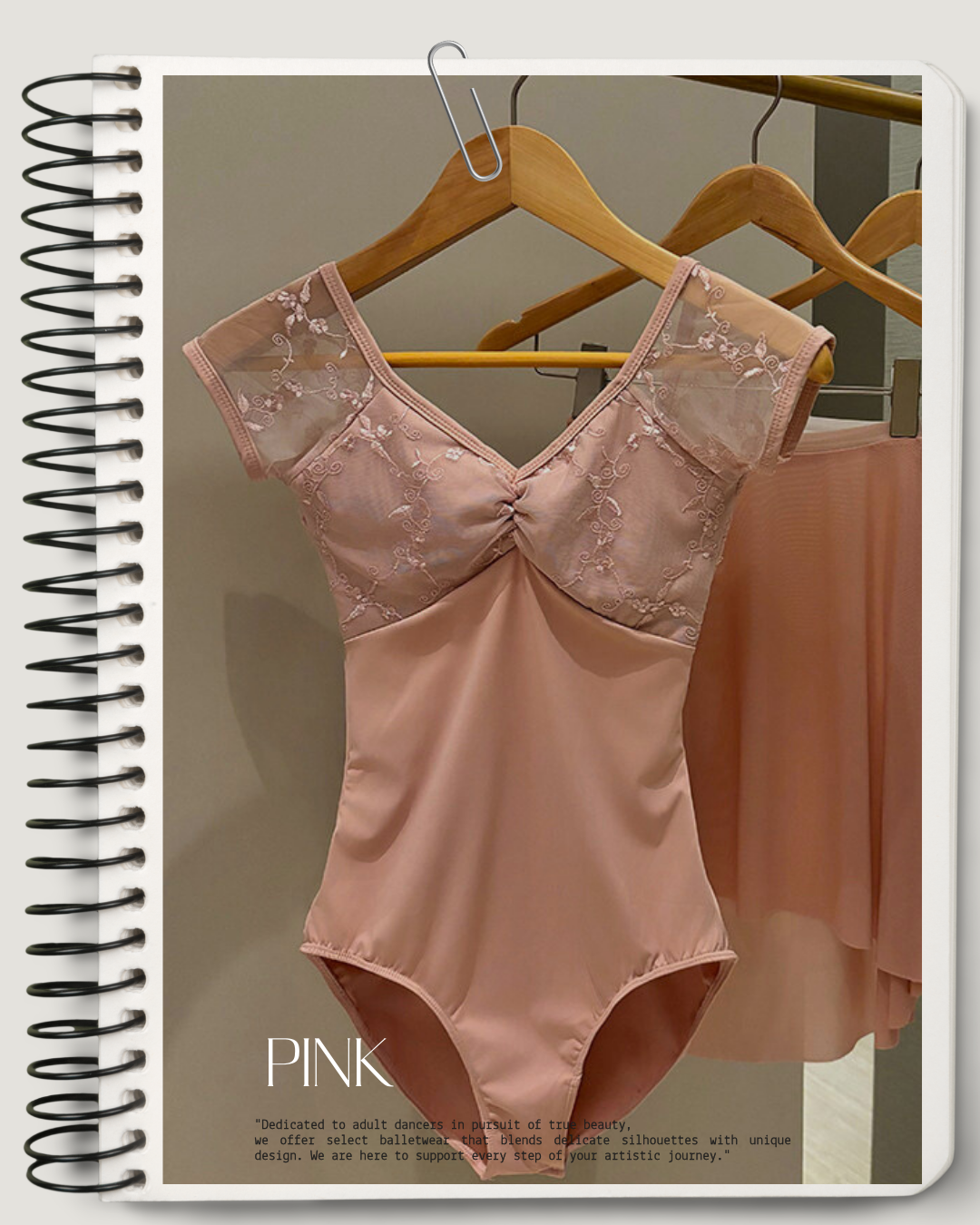 繊細な刺繍とレースを組み合わせた上品なデザインのレオタード。胸元のギャザーや透け感のあるショルダーが柔らかなニュアンスをプラスし、カラーごとに異なる雰囲気を楽しめます。身体のラインをすっきり見せながら動きやすさも意識した一枚のレオタードです。