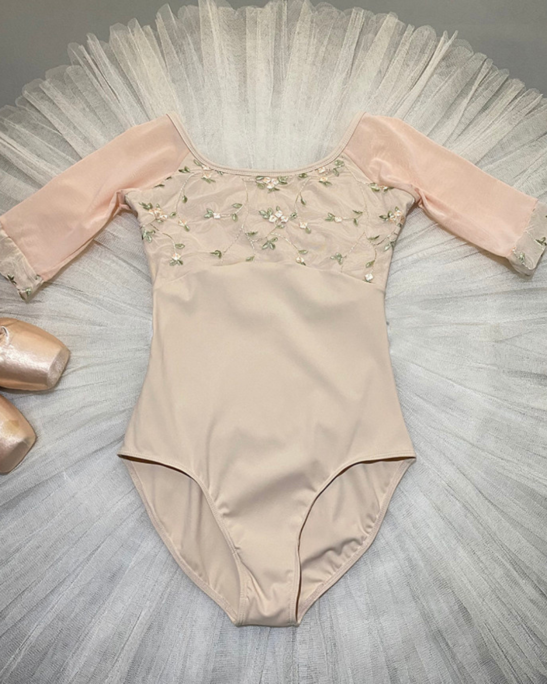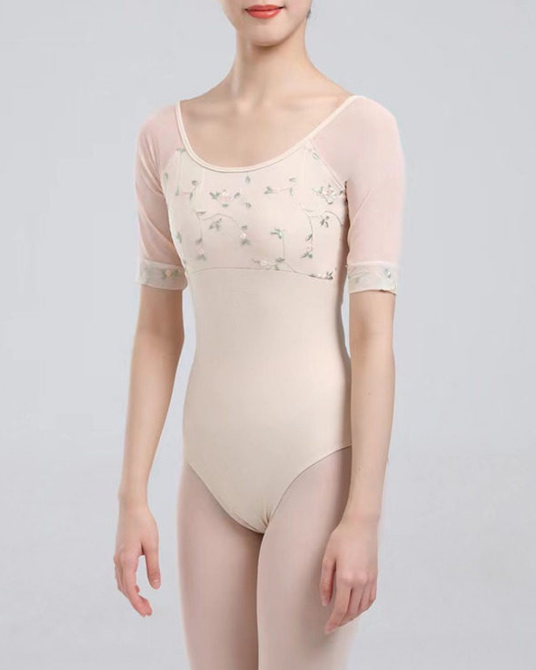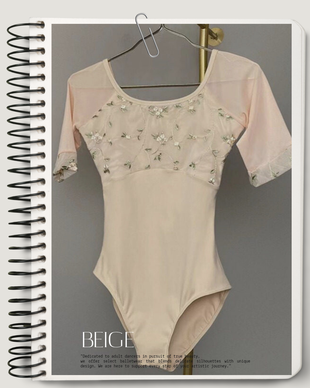 繊細な刺繍とシアー素材を組み合わせたやわらかな印象のレオタード。程よい丈感のスリーブが二の腕をさりげなくカバーしながら、軽やかな抜け感をプラスします。上品な配色とすっきりとしたシルエットで大人っぽく着られる一枚です。