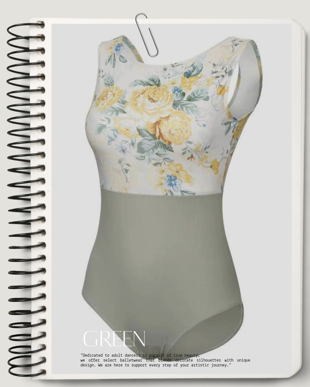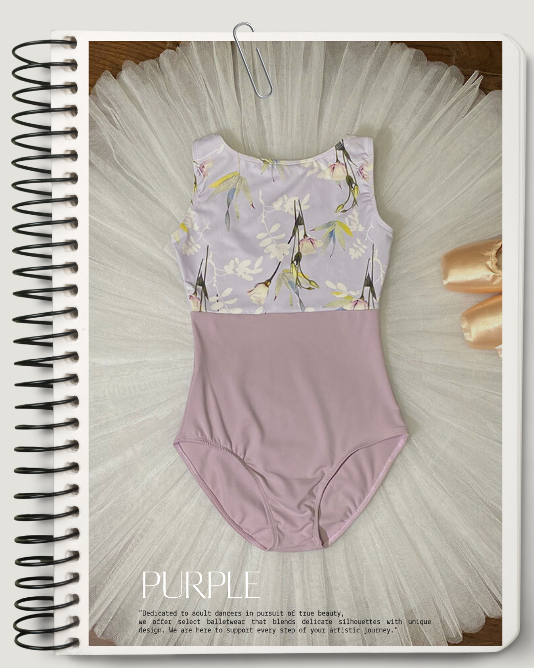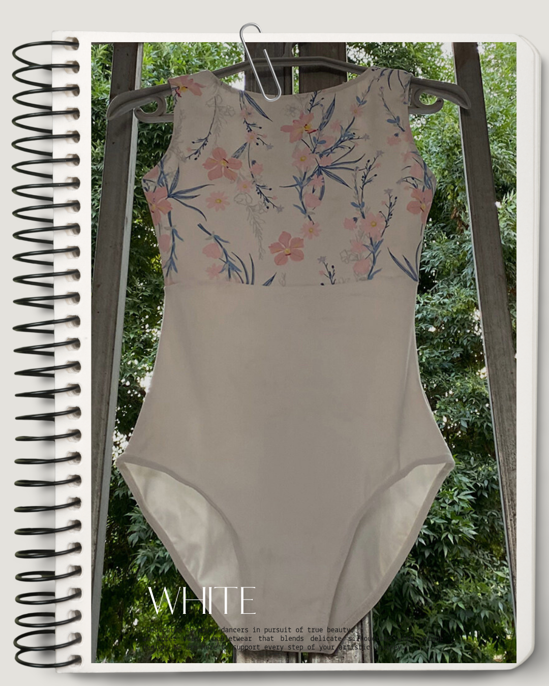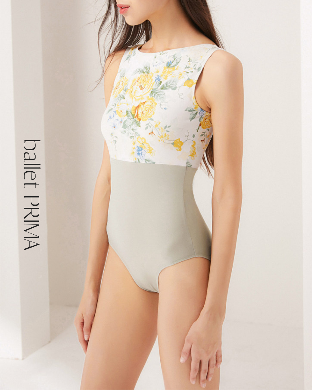フラワープリントを切り替えたノースリーブデザインのレオタード。上身頃の華やかな柄とシンプルなボディカラーのコントラストがすっきりとした印象を引き立てます。やわらかな配色で大人っぽく着られる一枚です。
