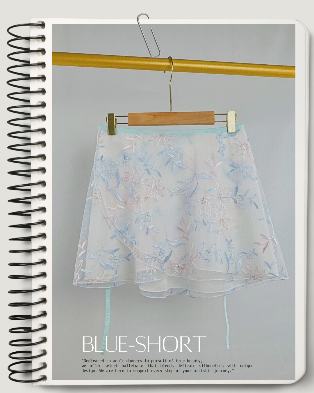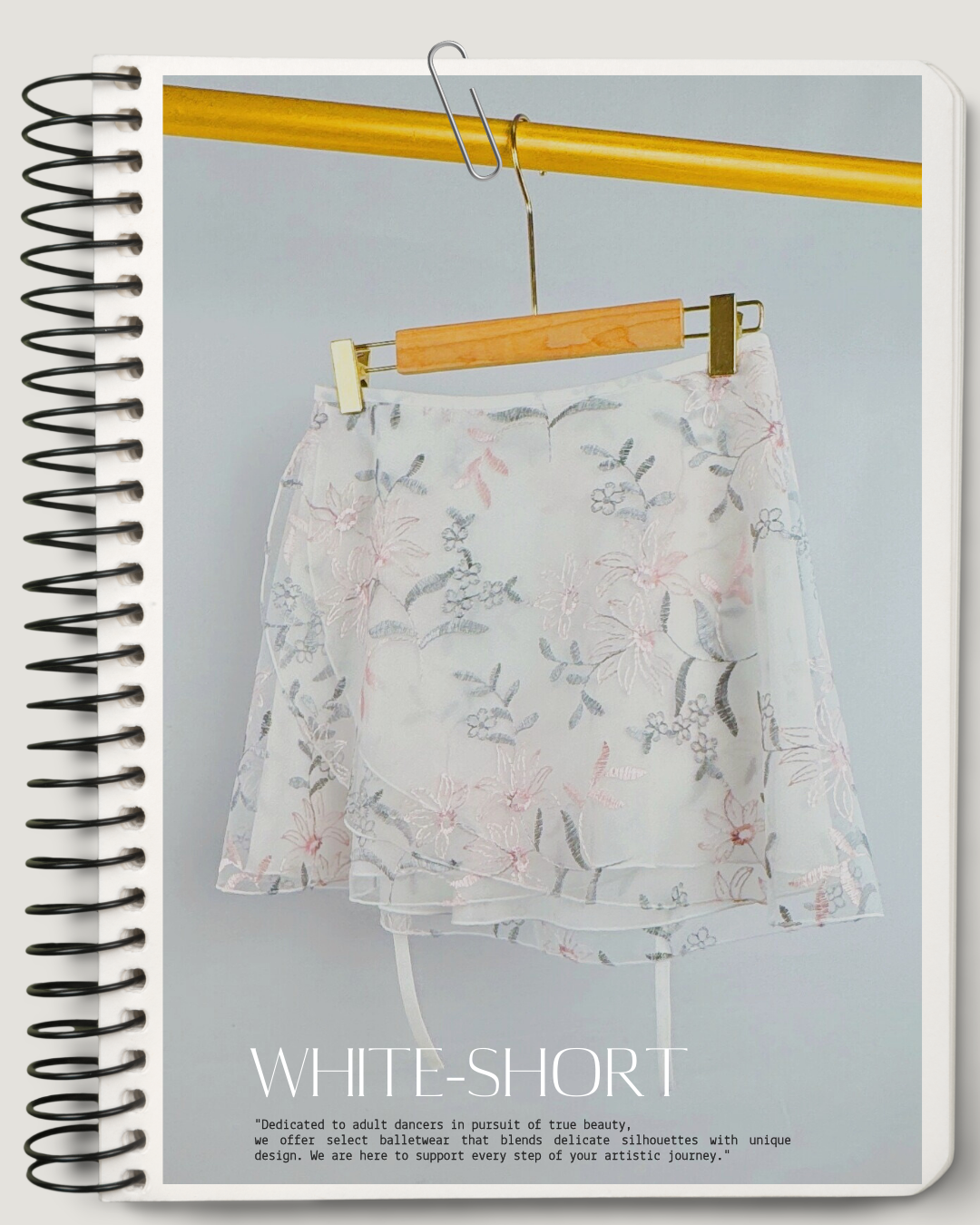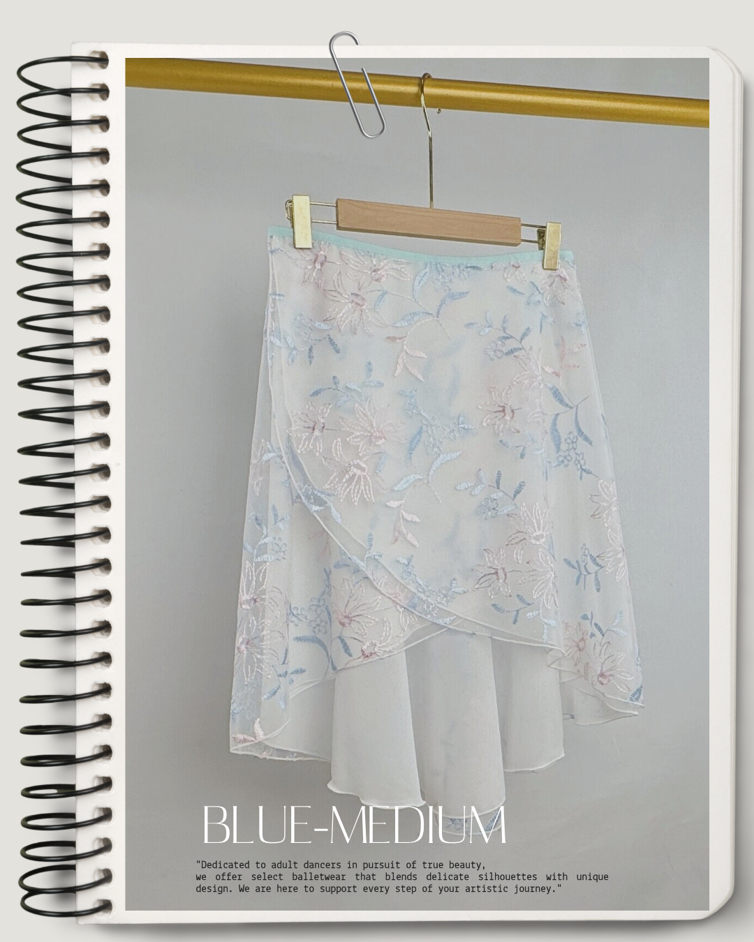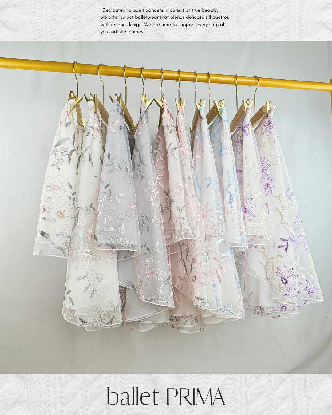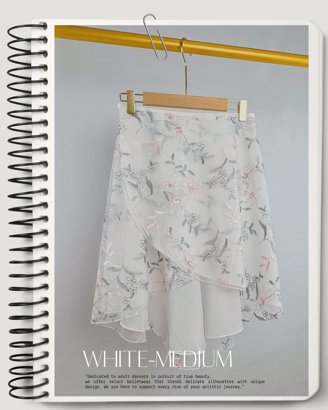 繊細なフラワー刺繍が浮かぶ軽やかな素材にアシンメトリーなラップデザインを重ねたスカート。ふんわり揺れるフレアシルエットが動きにやわらかなニュアンスを添え、ショート丈とミディ丈から選べる仕様です。レオタードに重ねてコーディネートのアクセントになる一枚です。