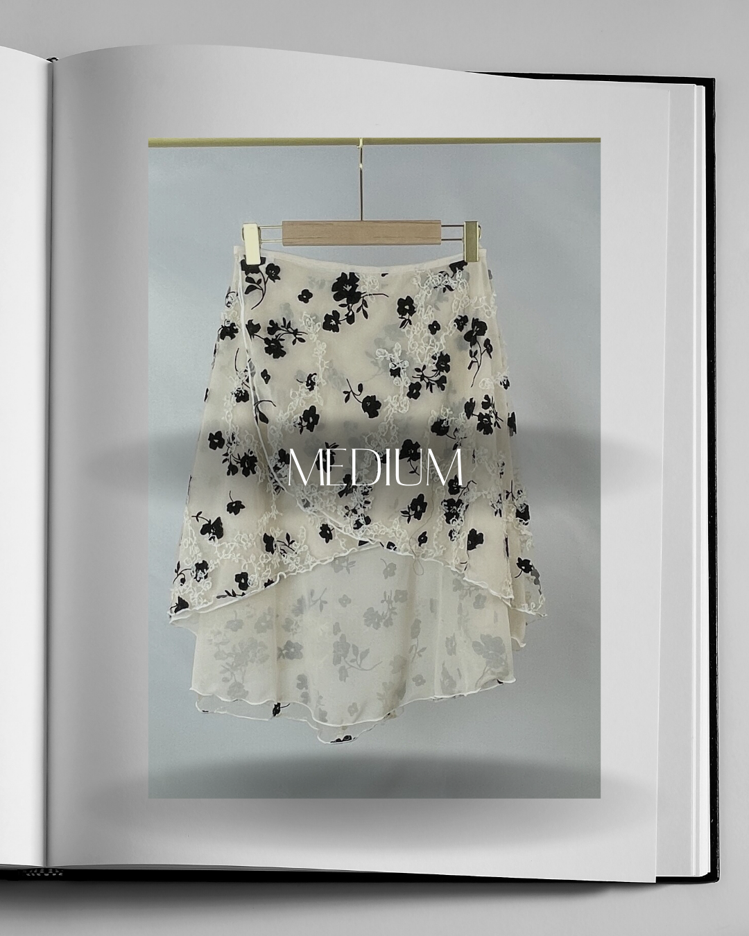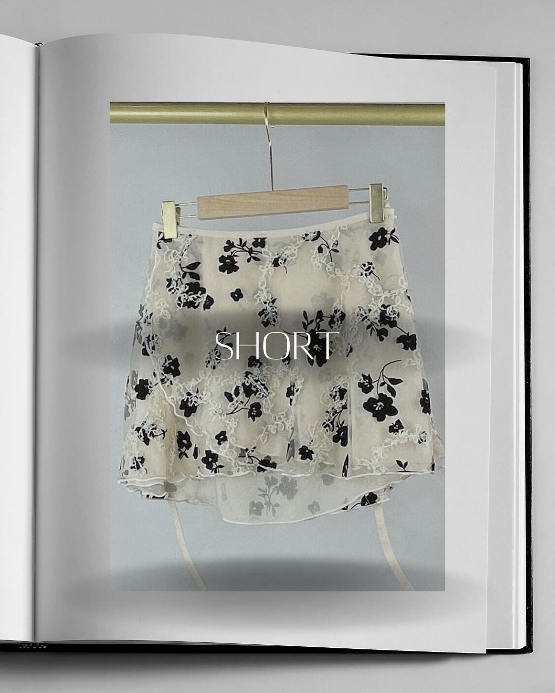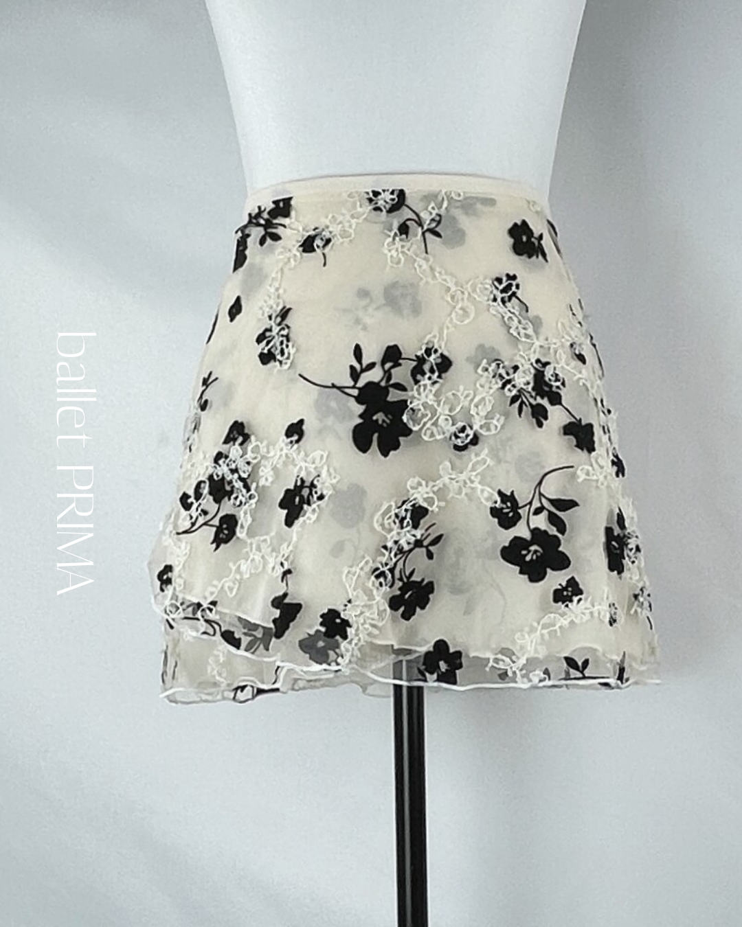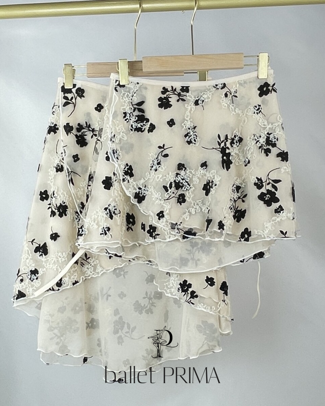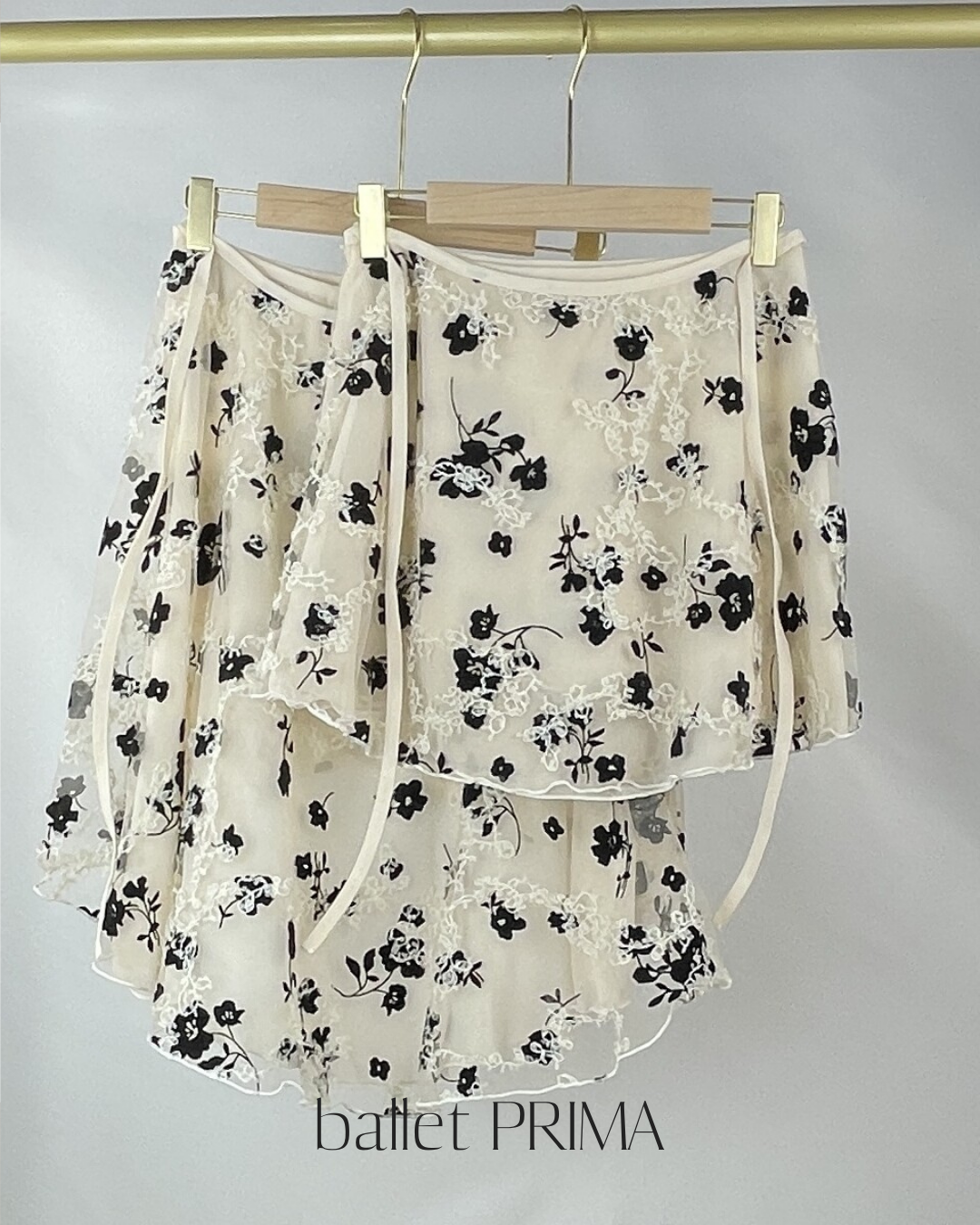 ブラックの小花柄レースを重ねた軽やかなレイヤードスカート。アシンメトリーに重なるヘムラインが動きに合わせて揺れ、スタイリングに立体感をプラス。ショートとミディ丈の2タイプ展開でバレエシーンにも合わせやすい一枚です。