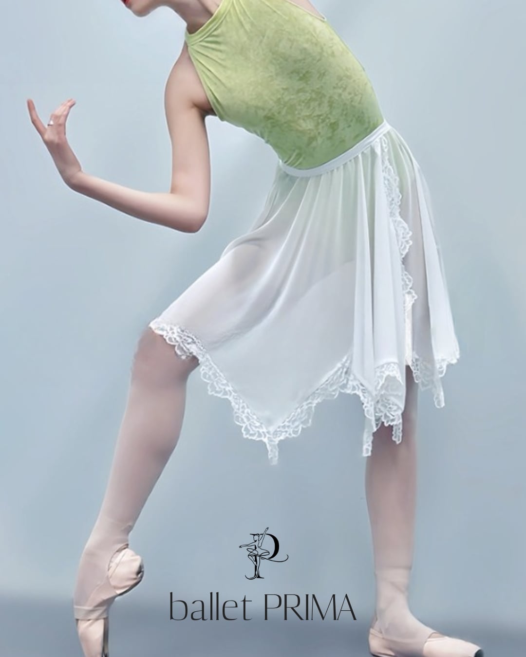 イレギュラーヘムのレース装飾が上品な、透け感があるミディアム丈スカートです。レースのディテールが華やかさをプラスし、特別な日や日常のレッスンにぴったりのアイテム!あなたのバレエスタイルに一層の洗練を演出します。