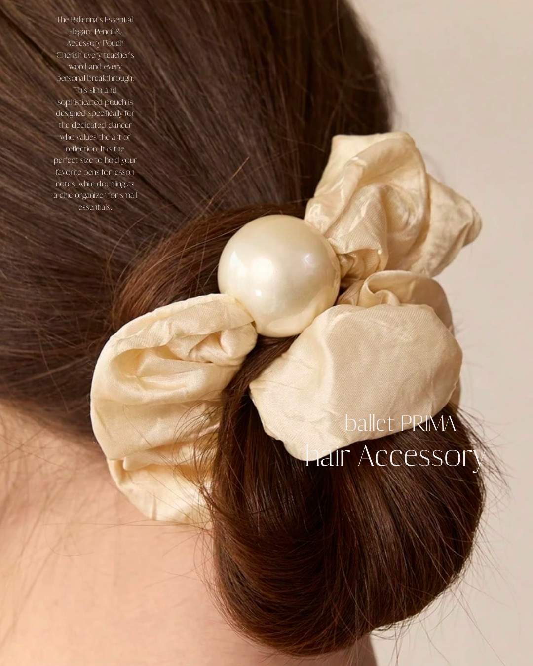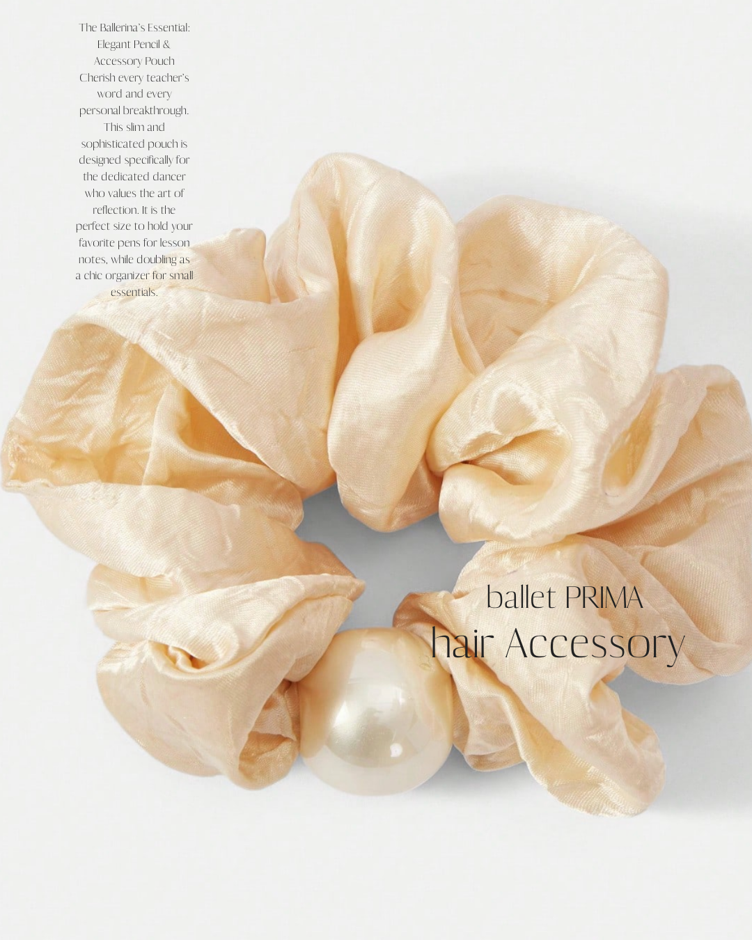 上品な光沢を放つシャンパンサテンが、まとめ髪に柔らかなニュアンスを添えるシュシュと