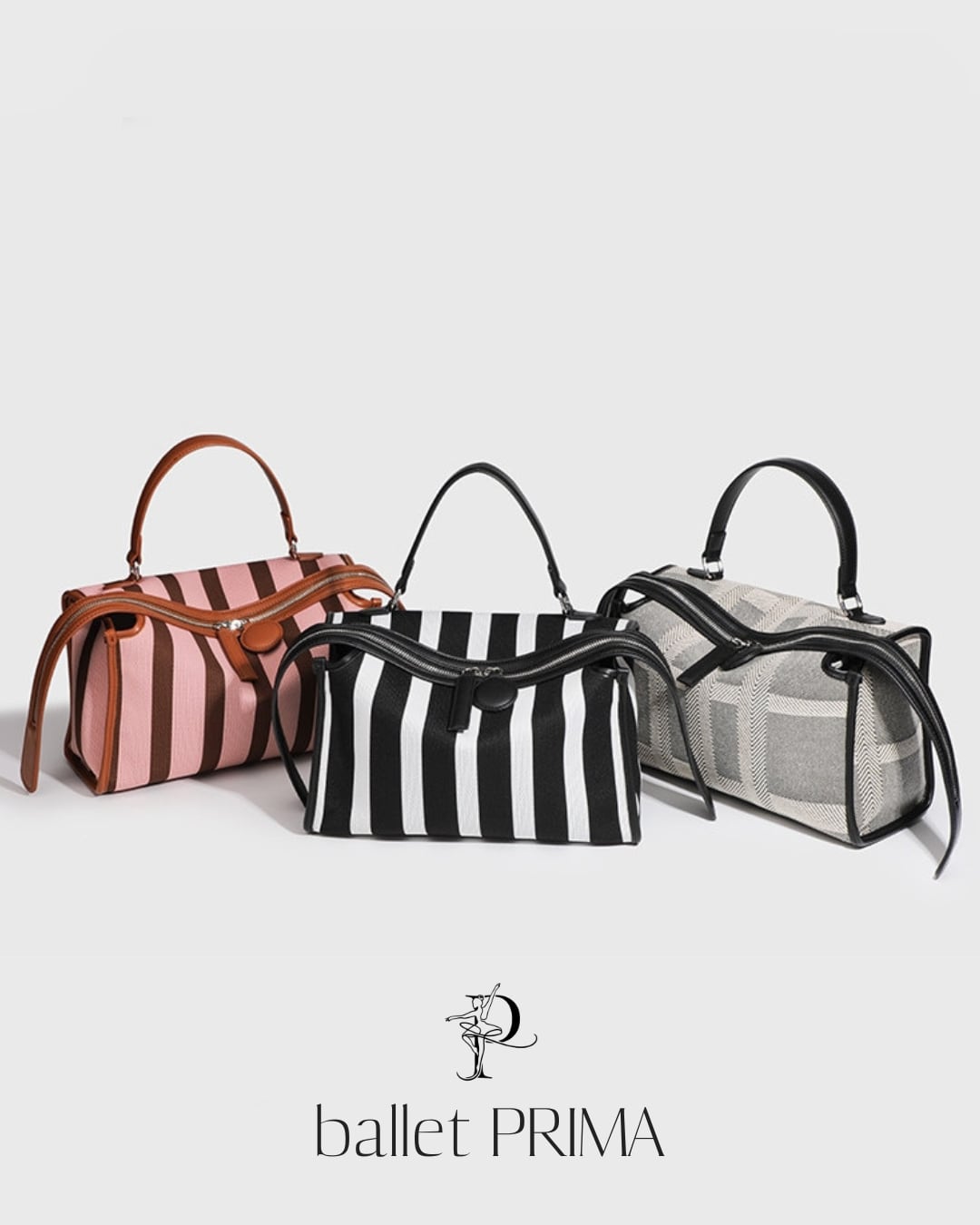 レッスンに必要なシューズやウェア、小物をまとめて収納できるボストンシルエットのハンドバッグ。しっかりとした素材感で肩掛けしやすく、スタジオへの移動も快適にサポートします。シンプルでシックなモノトーンのボーダーがコーディネートに馴染み、毎日のレッスン用バッグとして取り入れやすいデザインです。リュックとしても利用可能なストラップ付きです。