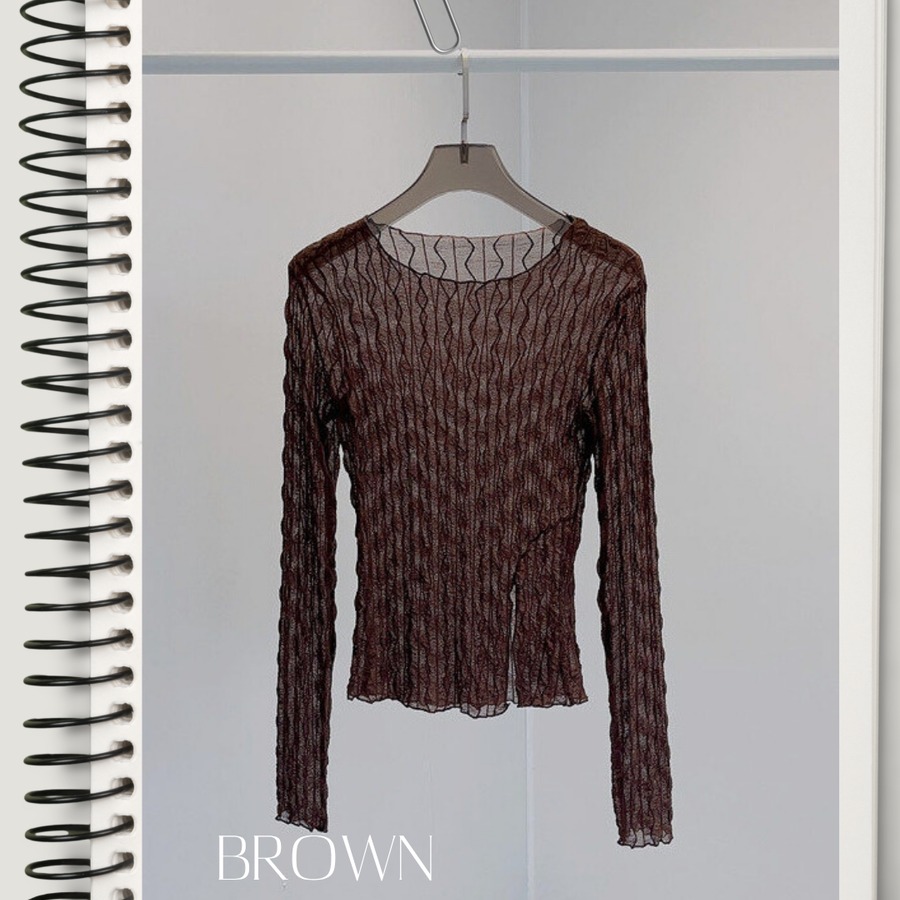 サイドスリット入りがアクセントになり、スリムなシルエットがボディラインを美しく見せるシアートップス。透け感のある軽やかなウェービー素材が、レイヤードスタイルに最適なニュアンスを与えます。360度デザインが洗練されており、カジュアルからエレガントまで幅広く活躍する一枚です。