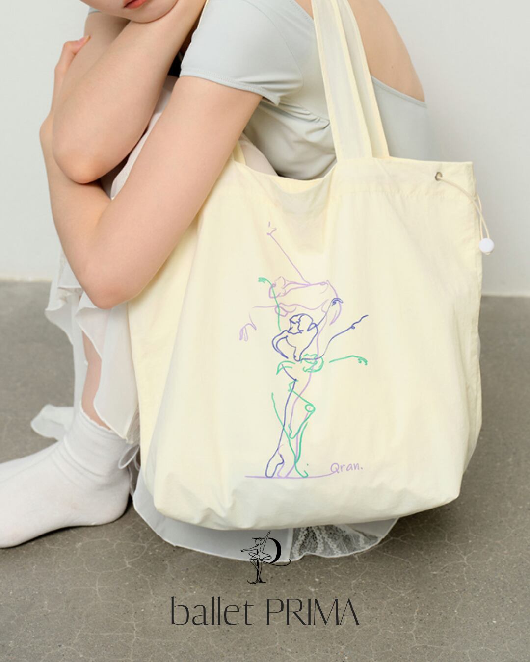 バレエモチーフの鮮やかなデザインが目を引くトートバッグ。上部にはドローコード付きで、デイリーからレッスンシーンまで使いやすいバランスに仕上げています。コーディネートにさりげなくアクセントを添えるバッグです。